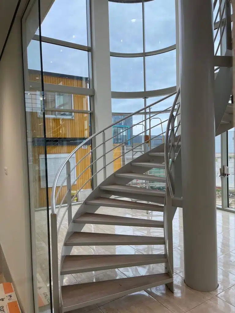 De stalen trap in de hoofdentree is een indrukwekkende spiltrap met een diameter van 3.000 mm. De treden van de spiltrap zijn voorzien van gezette bakjes gevuld met beton en afgewerkt met PVC. Dit zorgt voor een duurzame en esthetisch aantrekkelijke trap die de entree van het complex verrijkt.