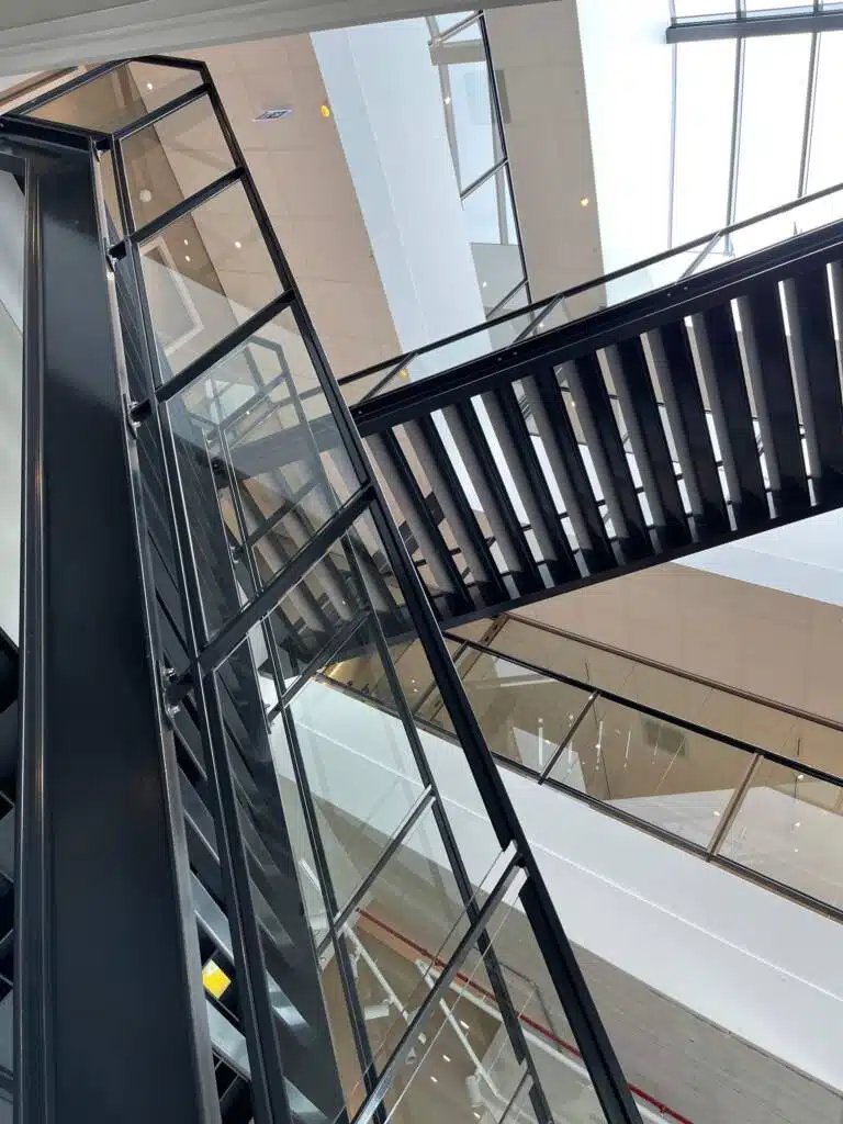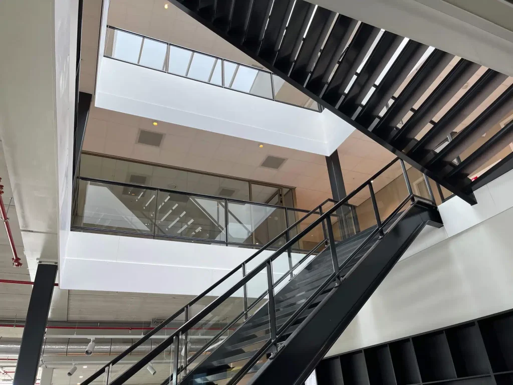 Het SHI-complex in Asten verwelkomt bezoekers met een combinatie van vakmanschap, functionaliteit en esthetiek, dankzij de hoogwaardige stalen trap en glazen balustraden van Janssen Staalwerk B.V.