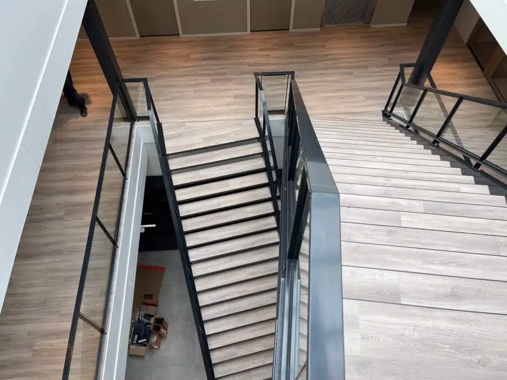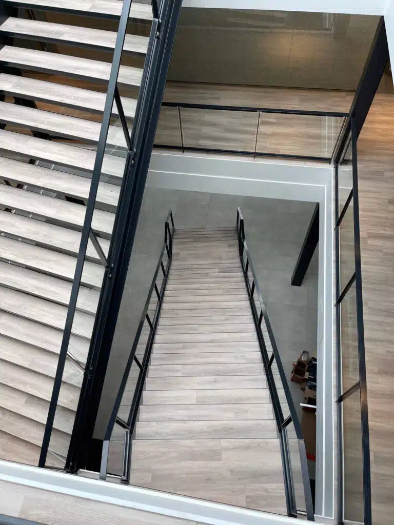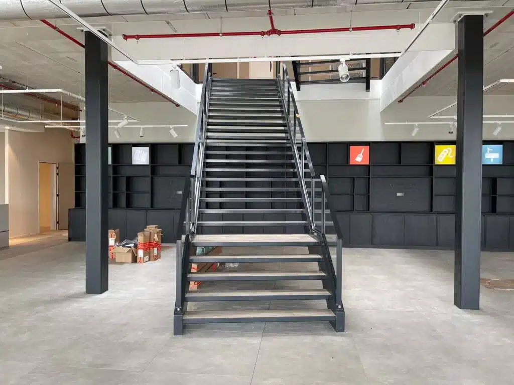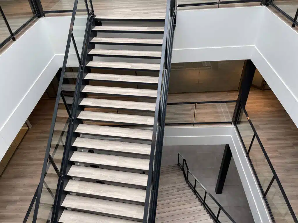 De stalen trap in de hoofdentree is vervaardigd met trapbomen UNP 320 en heeft als treden gezette bakjes gevuld met beton, met een afwerking met PVC. Dit zorgt voor een duurzame en stijlvolle trap die perfect past bij het moderne design van het complex.