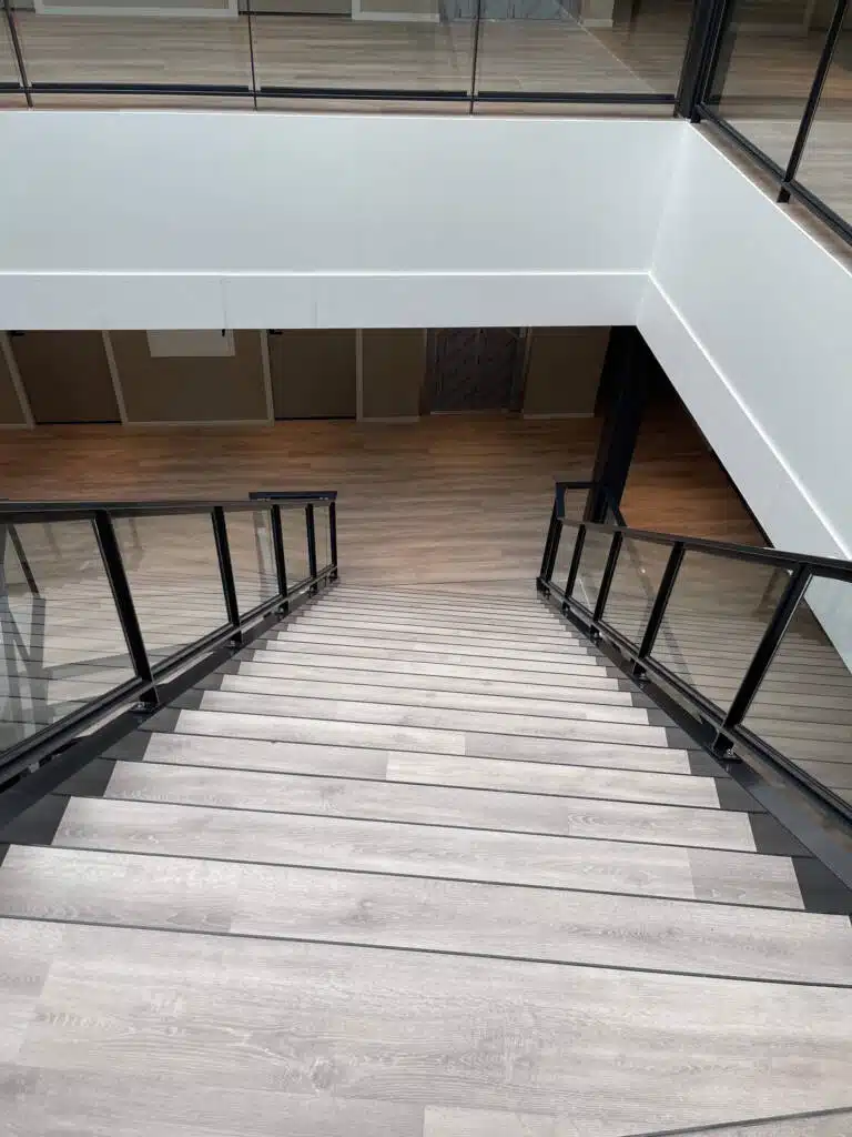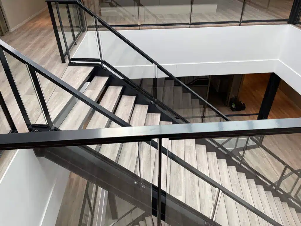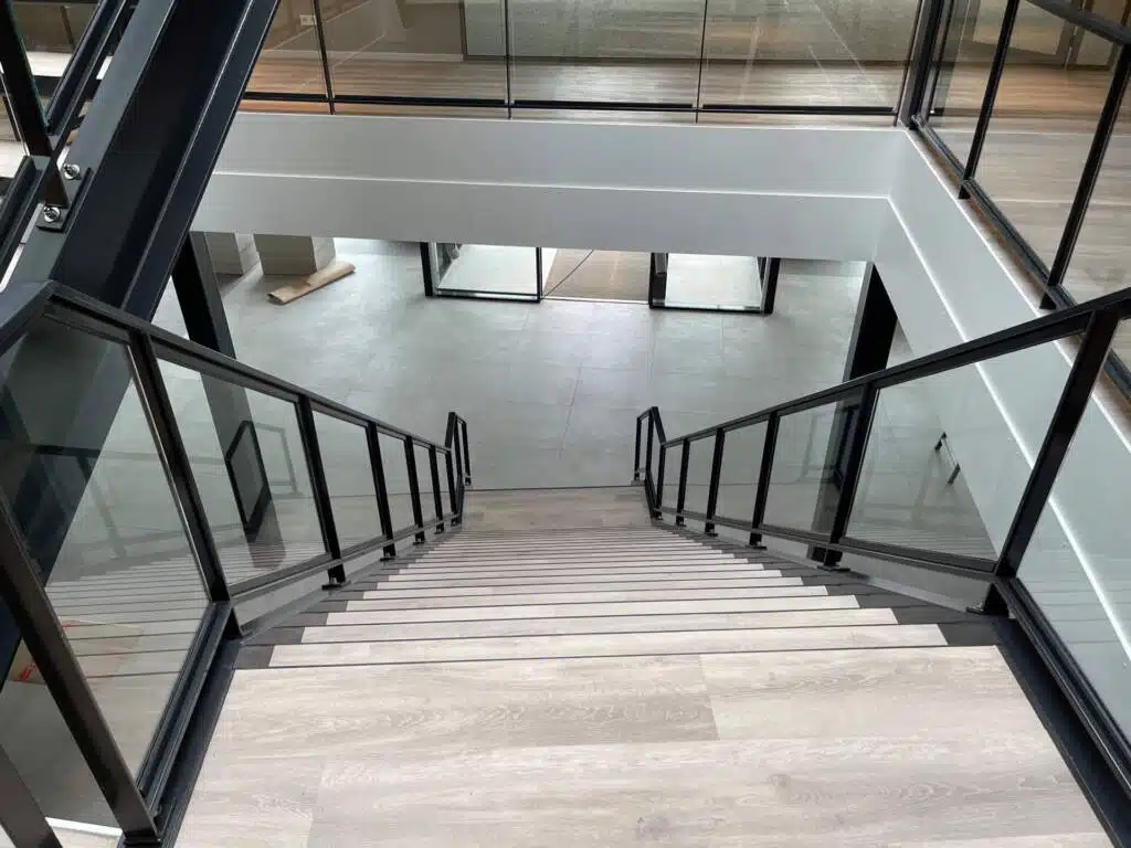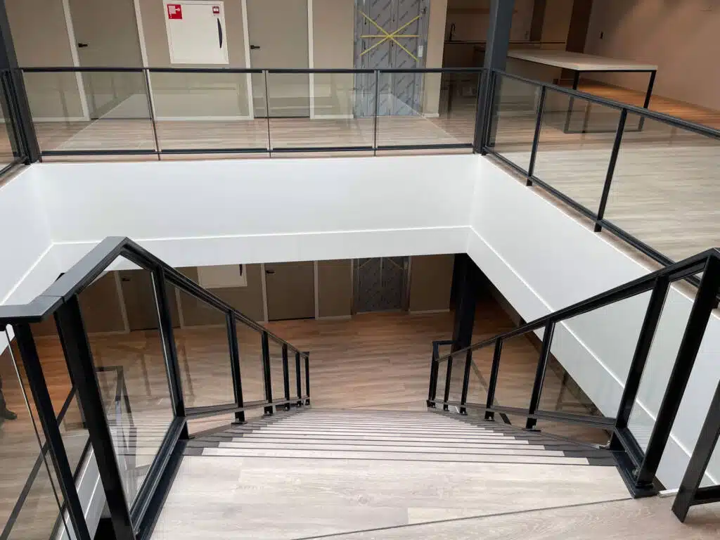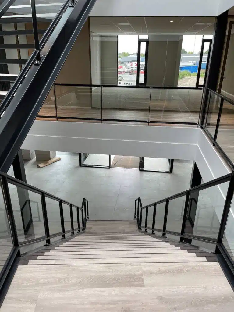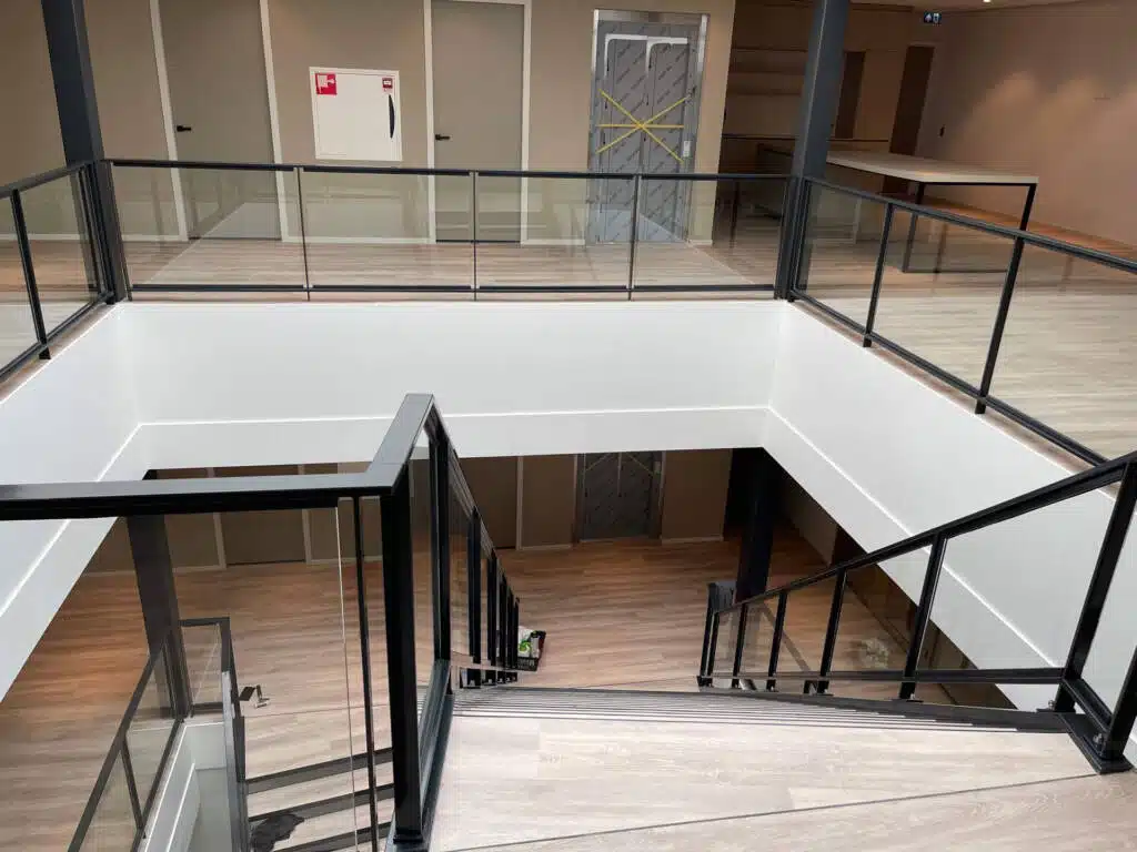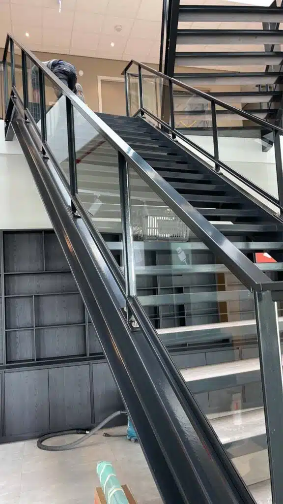 Langs de vrije zijden van de trap en de vide rand zijn balustraden geplaatst, bestaande uit stalen frames met ingeklemde glazen panelen. Deze balustraden bieden niet alleen veiligheid, maar creëren ook een open en lichte uitstraling, waardoor de ruimte optimaal wordt benut.